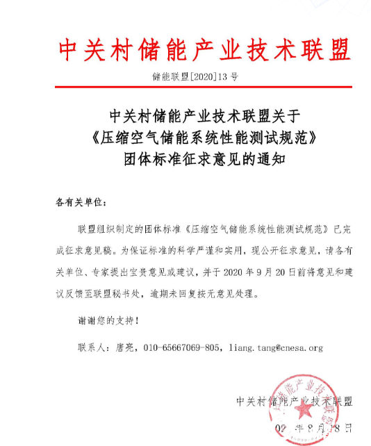 中關(guān)村儲(chǔ)能產(chǎn)業(yè)技術(shù)聯(lián)盟關(guān)于《壓縮空氣儲(chǔ)能系統(tǒng)性能測(cè)試規(guī)范》團(tuán)體標(biāo)準(zhǔn)征求意見(jiàn)的通知