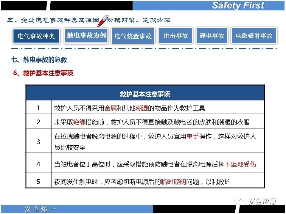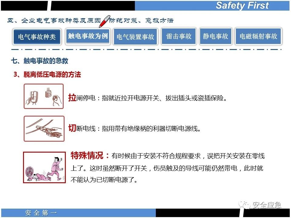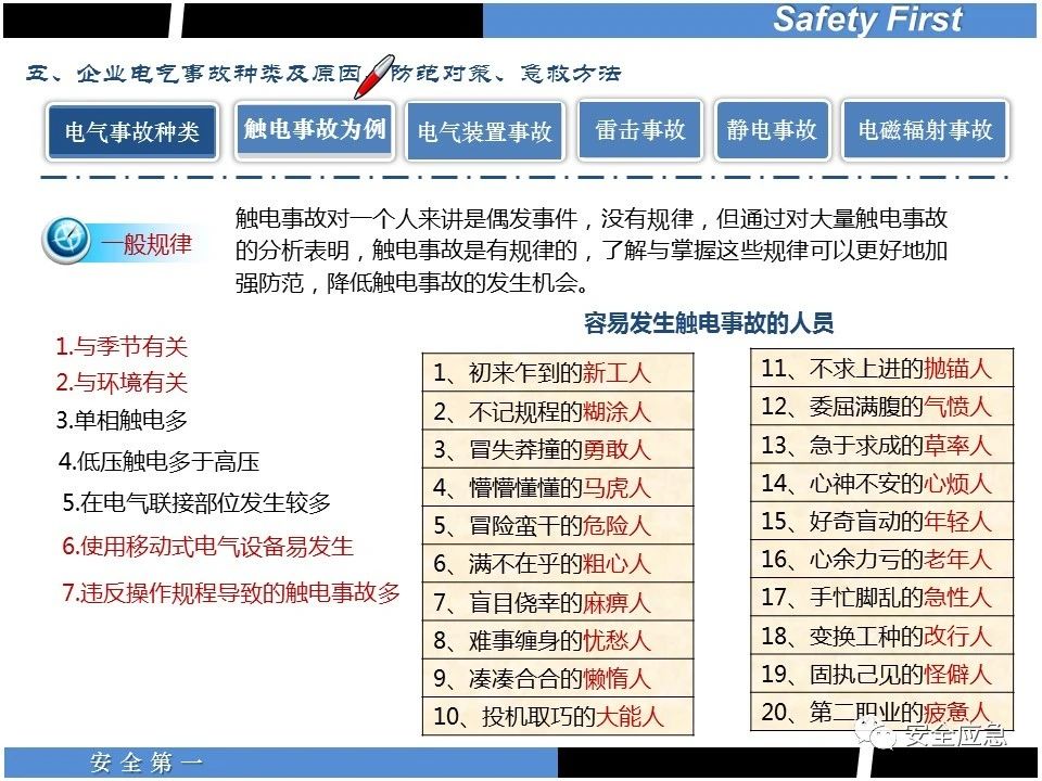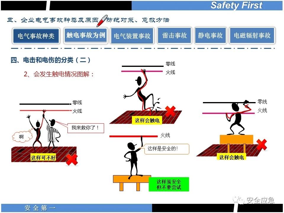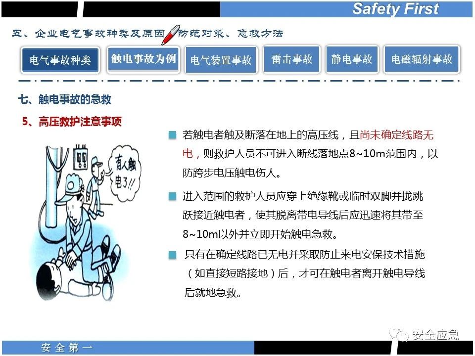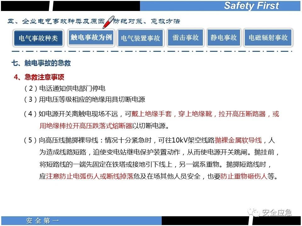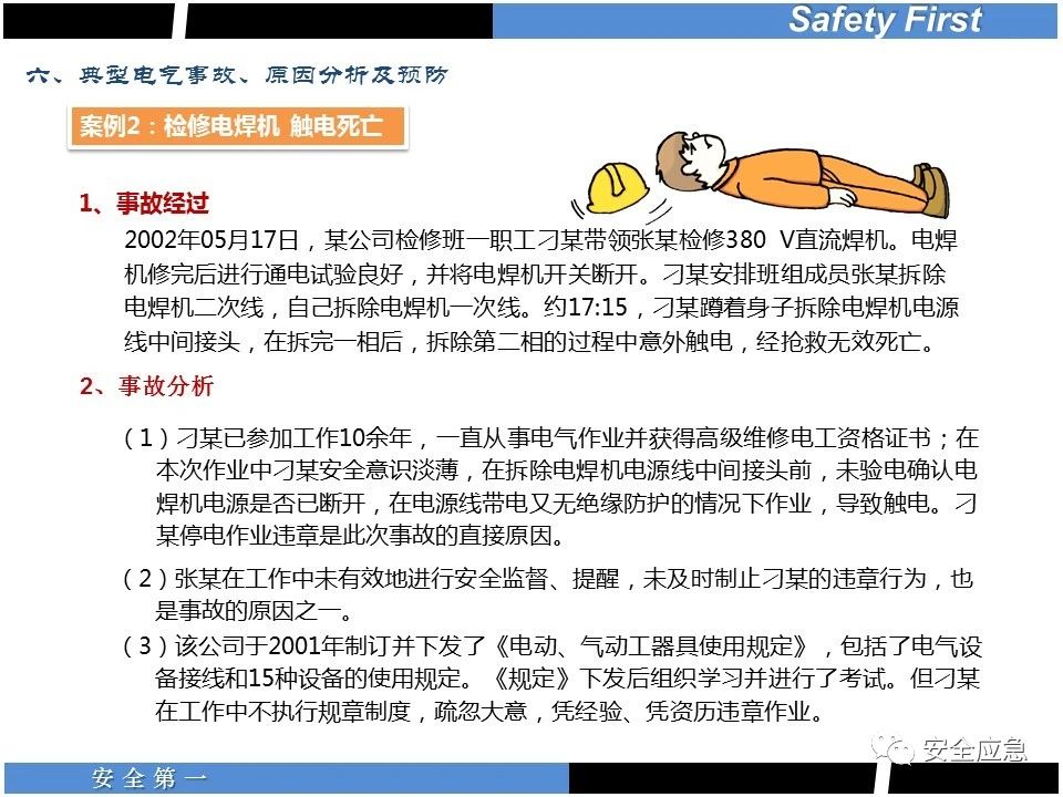 案例73 事故案例73:某35變電站準(zhǔn)備10kV避雷器試驗(yàn)。作業(yè)人員會(huì)同運(yùn)行人員準(zhǔn)備查看設(shè)備實(shí)際情況,拆卸10kV開關(guān)柜背板螺栓,打開了柜門上的電磁鎖,并打開了后柜門后,作業(yè)人員探頭進(jìn)入開關(guān)柜內(nèi)時(shí),對(duì)開關(guān)柜放電。 其它案例見17、18、19、20、21、22、23、50、52。 (27)多組人員組織混亂 案例74 事故案例74:某單位開展500kV線路停電檢修和地線融冰試驗(yàn)。1名工作人員不聽他人勸阻,登塔拆除引流線。隨后開展地線融冰試驗(yàn),該工作人員觸電死亡。 其它案例見45、46、47、48。 (28)交底不認(rèn)真 案例75 事故案例75:某工作負(fù)責(zé)人帶領(lǐng)兩名工作人員準(zhǔn)備在10kV線路裝設(shè)接地線。工作前,工作負(fù)責(zé)人沒有進(jìn)行班前(后)會(huì),沒有分配工作任務(wù),也沒有交代安全注意事項(xiàng),另外兩人也沒有主動(dòng)詢問(wèn),相互提醒,導(dǎo)致工作負(fù)責(zé)人無(wú)監(jiān)護(hù)誤登運(yùn)行線路,造成觸電。 其它案例見32。 (29)監(jiān)護(hù)不到位 l 單人工作無(wú)監(jiān)護(hù) 事故案例:36。 l 監(jiān)護(hù)人參與工作 事故案例:11。 l 監(jiān)護(hù)不認(rèn)真,或默許違章行為 事故案例:67。 (30)人員、工作安排不恰當(dāng) 案例76 事故案例76:某供電所安排不具備單獨(dú)工作資格和能力的新入廠員工上桿進(jìn)行配變?cè)O(shè)備搶修工作,由于安全距離不夠,員工經(jīng)驗(yàn)不足,監(jiān)護(hù)不到位,導(dǎo)致觸電。 案例77 事故案例77:某高壓試驗(yàn)班開展定檢預(yù)試作業(yè)。工作負(fù)責(zé)人與工作人員在抄錄放電計(jì)數(shù)器銘牌,另一名剛參加工作不久的工作人員拿著自制試驗(yàn)線插入移動(dòng)電源盤插座內(nèi),然后,用左、右手分別拿住兩個(gè)鱷魚夾準(zhǔn)備對(duì)放電器搭接做試驗(yàn),左、右手習(xí)慣性的分別握住了兩個(gè)鱷魚夾的導(dǎo)體部分,此時(shí)電流通過(guò)人體,漏電保護(hù)器沒有動(dòng)作,觸電死亡。 (31)單人作業(yè) l 野外單人巡線、勘察 案例78 事故案例78:某單位開展線路巡視時(shí),單人作業(yè),在被告知“巡視完N58塔后切勿過(guò)江,要沿原路返回”的情況下,仍然獨(dú)自一人違規(guī)游泳過(guò)江,溺水身亡。 案例79 事故案例79:某單位野外勘察時(shí),某工作人員在未告知工作負(fù)責(zé)人的情況下,獨(dú)自一人返回車輛所在地,途中墜落懸崖暈倒,受輕傷并失蹤12小時(shí)。 附件:最全面的電氣安全培訓(xùn),實(shí)用!