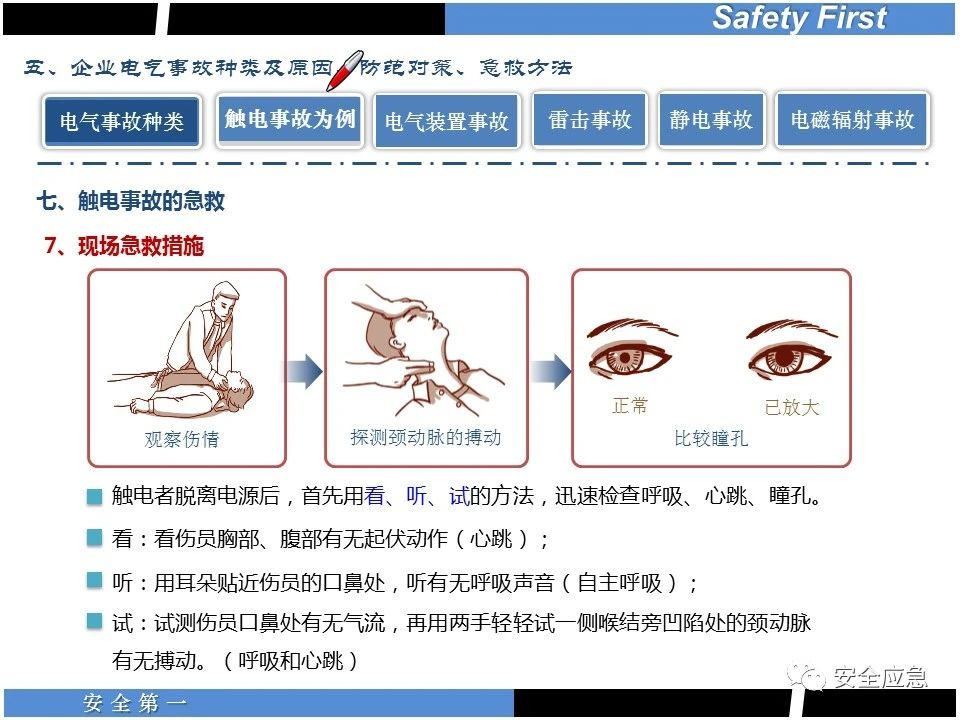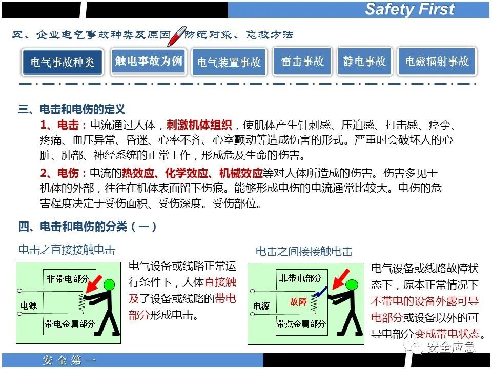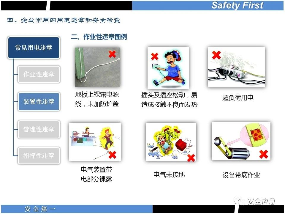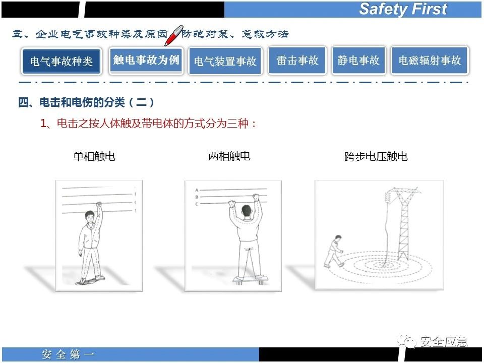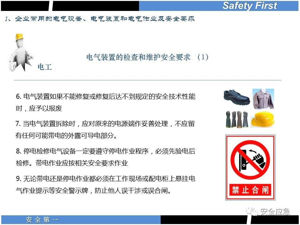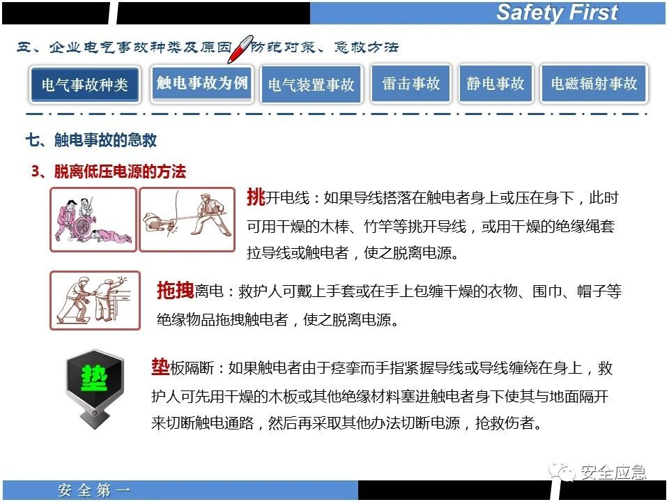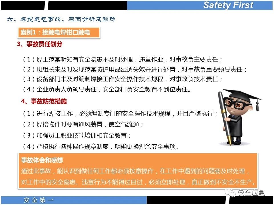 案例73 事故案例73:某35變電站準(zhǔn)備10kV避雷器試驗(yàn)。作業(yè)人員會(huì)同運(yùn)行人員準(zhǔn)備查看設(shè)備實(shí)際情況,拆卸10kV開關(guān)柜背板螺栓,打開了柜門上的電磁鎖,并打開了后柜門后,作業(yè)人員探頭進(jìn)入開關(guān)柜內(nèi)時(shí),對(duì)開關(guān)柜放電。 其它案例見17、18、19、20、21、22、23、50、52。 (27)多組人員組織混亂 案例74 事故案例74:某單位開展500kV線路停電檢修和地線融冰試驗(yàn)。1名工作人員不聽他人勸阻,登塔拆除引流線。隨后開展地線融冰試驗(yàn),該工作人員觸電死亡。 其它案例見45、46、47、48。 (28)交底不認(rèn)真 案例75 事故案例75:某工作負(fù)責(zé)人帶領(lǐng)兩名工作人員準(zhǔn)備在10kV線路裝設(shè)接地線。工作前,工作負(fù)責(zé)人沒有進(jìn)行班前(后)會(huì),沒有分配工作任務(wù),也沒有交代安全注意事項(xiàng),另外兩人也沒有主動(dòng)詢問(wèn),相互提醒,導(dǎo)致工作負(fù)責(zé)人無(wú)監(jiān)護(hù)誤登運(yùn)行線路,造成觸電。 其它案例見32。 (29)監(jiān)護(hù)不到位 l 單人工作無(wú)監(jiān)護(hù) 事故案例:36。 l 監(jiān)護(hù)人參與工作 事故案例:11。 l 監(jiān)護(hù)不認(rèn)真,或默許違章行為 事故案例:67。 (30)人員、工作安排不恰當(dāng) 案例76 事故案例76:某供電所安排不具備單獨(dú)工作資格和能力的新入廠員工上桿進(jìn)行配變?cè)O(shè)備搶修工作,由于安全距離不夠,員工經(jīng)驗(yàn)不足,監(jiān)護(hù)不到位,導(dǎo)致觸電。 案例77 事故案例77:某高壓試驗(yàn)班開展定檢預(yù)試作業(yè)。工作負(fù)責(zé)人與工作人員在抄錄放電計(jì)數(shù)器銘牌,另一名剛參加工作不久的工作人員拿著自制試驗(yàn)線插入移動(dòng)電源盤插座內(nèi),然后,用左、右手分別拿住兩個(gè)鱷魚夾準(zhǔn)備對(duì)放電器搭接做試驗(yàn),左、右手習(xí)慣性的分別握住了兩個(gè)鱷魚夾的導(dǎo)體部分,此時(shí)電流通過(guò)人體,漏電保護(hù)器沒有動(dòng)作,觸電死亡。 (31)單人作業(yè) l 野外單人巡線、勘察 案例78 事故案例78:某單位開展線路巡視時(shí),單人作業(yè),在被告知“巡視完N58塔后切勿過(guò)江,要沿原路返回”的情況下,仍然獨(dú)自一人違規(guī)游泳過(guò)江,溺水身亡。 案例79 事故案例79:某單位野外勘察時(shí),某工作人員在未告知工作負(fù)責(zé)人的情況下,獨(dú)自一人返回車輛所在地,途中墜落懸崖暈倒,受輕傷并失蹤12小時(shí)。 附件:最全面的電氣安全培訓(xùn),實(shí)用!