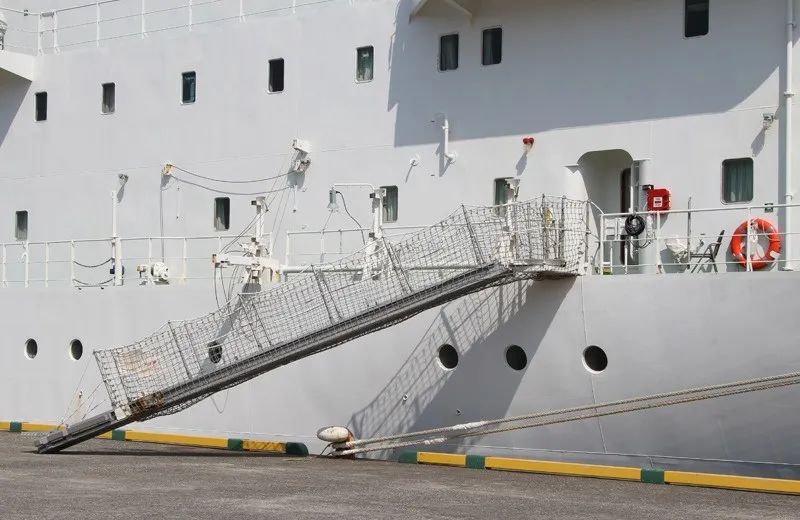 根據(jù)新生效的GB/T11701-2021《船用舷梯的基本規(guī)定》(3月1日起施行),舷梯主要分為兩類: (1)旋轉(zhuǎn)平臺式舷梯 單節(jié)舷梯、多節(jié)舷梯或伸縮舷梯的結(jié)構(gòu)與上面的旋轉(zhuǎn)平臺鉸接,可在船與登梯底面之間改變方向和傾斜角度。舷梯可用鋼絲繩或鏈從較低的(各)懸掛點(diǎn)掛住,或用固定在舷梯底部滾柱支持。 (2)固定平臺式舷梯 單節(jié)舷梯、多節(jié)舷梯或伸縮舷梯的結(jié)構(gòu)與上面的固定平臺鉸接,可在船和登梯底面之間改變傾斜角度。舷梯用鋼絲繩或鏈從較低的(各)懸掛點(diǎn)掛住,單獨(dú)使用的引航員舷梯采用此固定平臺式舷梯。 根據(jù)SOLAS第II-1章第3-9條款,凡是2010年1月1日及以后建造的船舶,必須在船上安裝經(jīng)認(rèn)可的登/離船設(shè)施,以備在港口或港口相關(guān)操作時(shí)使用。 該登/離船設(shè)施必須根據(jù)MSC.1/Circ.1331通函的要求進(jìn)行建造、測試、安裝及維護(hù),主要包括以下八點(diǎn)要求: (1)登/離船設(shè)施應(yīng)遠(yuǎn)離工作區(qū)域以及貨物或其它物體懸掛吊裝時(shí)可能通過上方的區(qū)域,該登/離船設(shè)施的目的和使用方式與引水員登 / 離船裝置是不同的; (2)應(yīng)提供足夠的照明,以照亮登/離船設(shè)施、甲板上人員登/離船和裝置控制的位置; (3)當(dāng)?shù)?離船裝置在使用時(shí),在其附近應(yīng)備有一只帶有自亮浮燈和救生浮索的救生圈(注意這里是要求一只救生圈既配備有自亮浮燈又配備有救生浮索,并且處于隨時(shí)可用狀態(tài)); (4)每部舷梯應(yīng)具有在其最大操作傾斜角時(shí),下平臺在最輕載水線以上不大于600mm的高度; (5)在每部舷梯或跳板梯的兩端應(yīng)設(shè)置一塊標(biāo)記牌,以清楚顯示安全操作和負(fù)荷限制,包括最大和最小允許設(shè)計(jì)傾斜角、設(shè)計(jì)負(fù)荷、最大底端板負(fù)荷等,如果最大操作負(fù)荷小于設(shè)計(jì)負(fù)荷,則最大操作負(fù)荷也應(yīng)顯示在標(biāo)記牌上; (6)跳板梯使用時(shí)安放水平傾斜角不應(yīng)大于30度和舷梯使用時(shí)水平傾斜角不應(yīng)大于55度; (7)在人員從登/離船設(shè)施或船舶與碼頭之間可能墜落的舷梯下應(yīng)安放安全網(wǎng); (8)正確設(shè)置舷梯下平臺的安全插銷。 收放前:應(yīng)對升降機(jī)械、鋼絲繩、滑車轉(zhuǎn)盤平臺支架等進(jìn)行檢查,確認(rèn)設(shè)備完好,鋼絲、卷筒、吊梁無障礙后方可作業(yè)。 收放過程中: (1)船靠離碼頭收放舷梯過程中,應(yīng)有專人指揮,作業(yè)人員默契配合。在浮動(dòng)的梯子上進(jìn)行收起、安裝欄桿、護(hù)繩作業(yè)時(shí),應(yīng)先檢查平臺支架是否已可靠支好,并使用止蕩索,上舷梯操作人員必須系好安全帶,穿好救生衣。 (2)舷梯落岸下踏板應(yīng)避開障礙物,安放平穩(wěn),嚴(yán)禁扭曲。吊梁、鏈條要注意絞高或安放妥當(dāng),以免碰頭和妨礙上下船。 (3)由于潮夕、裝卸貨、碼頭環(huán)境等因素影響,舷梯不能放置碼頭時(shí),要注意隨時(shí)調(diào)整舷梯高度。當(dāng)舷梯下踏板離碼頭較高較遠(yuǎn)時(shí),不允許勉強(qiáng)上下。梯口值班人員負(fù)責(zé)調(diào)整舷梯和提醒上下人員注意安全,必要時(shí)應(yīng)按規(guī)定加裝橋梯。 (4)由于漲落潮、移泊等原因需要松緊纜繩時(shí),應(yīng)絞起舷梯,收起橋梯,或?qū)H丝春锰菘诮谷藛T上下。在無法使用舷梯時(shí),要正確地搭設(shè)橋梯,必須綁扎牢固、裝妥扶手、掛好安全網(wǎng)后人員方可上下。禁止從船舷直接跳上碼頭,或從碼頭直接跳上船。 (5)舷梯、橋梯必須按規(guī)定張掛安全網(wǎng)。舷梯、橋梯處應(yīng)有防墜落、防滑等安全指示標(biāo)志。舷梯、橋梯的扶手、扶繩、階梯必須保持清爽、干凈、牢固,便于上下人員抓牢、踏實(shí)。 (6)禁止用舷梯吊運(yùn)物品,禁止超載。