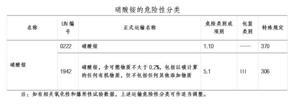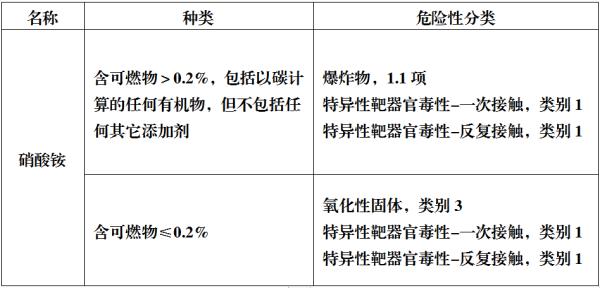 按照《危險化學(xué)品目錄》(2015年),硝酸銨分為兩種,其危險性分類有: