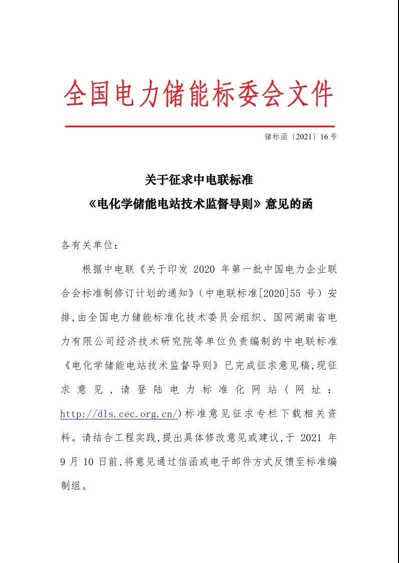 征求意見:關于征求中電聯(lián)標準《電化學儲能電站技術監(jiān)督導則》意見的函
