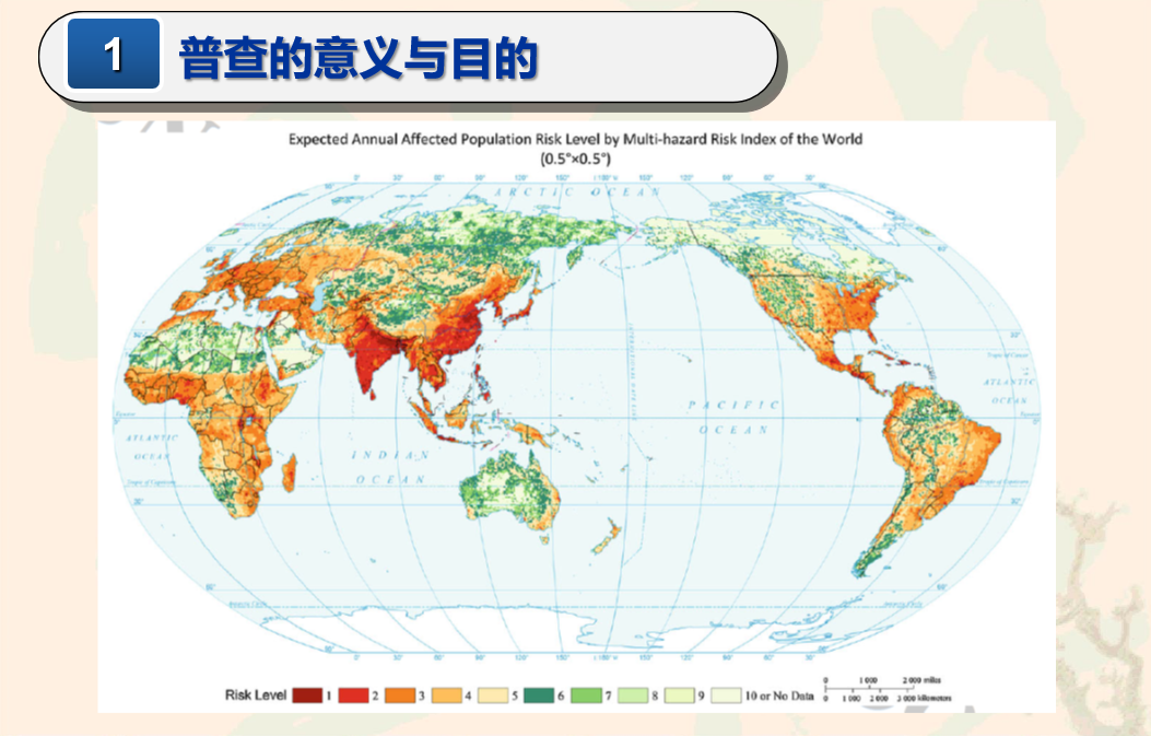 而用風(fēng)險來指引可持續(xù)發(fā)展,首要任務(wù)是要正確評估和理解風(fēng)險,特別是不同尺度下的多災(zāi)種綜合風(fēng)險及其影響因素和機制。災(zāi)害綜合風(fēng)險普查為此提供了前所未有的機遇和基礎(chǔ)性工作。并且在以往的工作當(dāng)中,我們也能看到自然致災(zāi)因子信息相對分散,歷史自然災(zāi)害信息不全面、空間分布模糊,自然災(zāi)害風(fēng)險評估、自然災(zāi)害自然致災(zāi)因子信息相對分散,隱患調(diào)查欠缺,防災(zāi)減災(zāi)抗災(zāi)救災(zāi)能力不明等現(xiàn)實困境與問題。所以為了解決這些問題,我們就要摸清全國災(zāi)害風(fēng)險隱患底數(shù)、查明重點區(qū)域抗災(zāi)減災(zāi)能力、客觀的認(rèn)識全國和各地區(qū)災(zāi)害綜合風(fēng)險水平,這就是該項普查的目的和意義所在。
