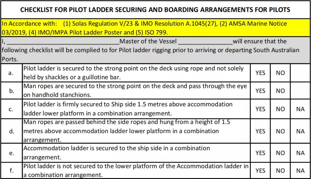 ·在抵達(dá)南澳大利亞港口之前,所有船長(zhǎng)都應(yīng)填寫隨附的引航梯固定和登船安排清單。