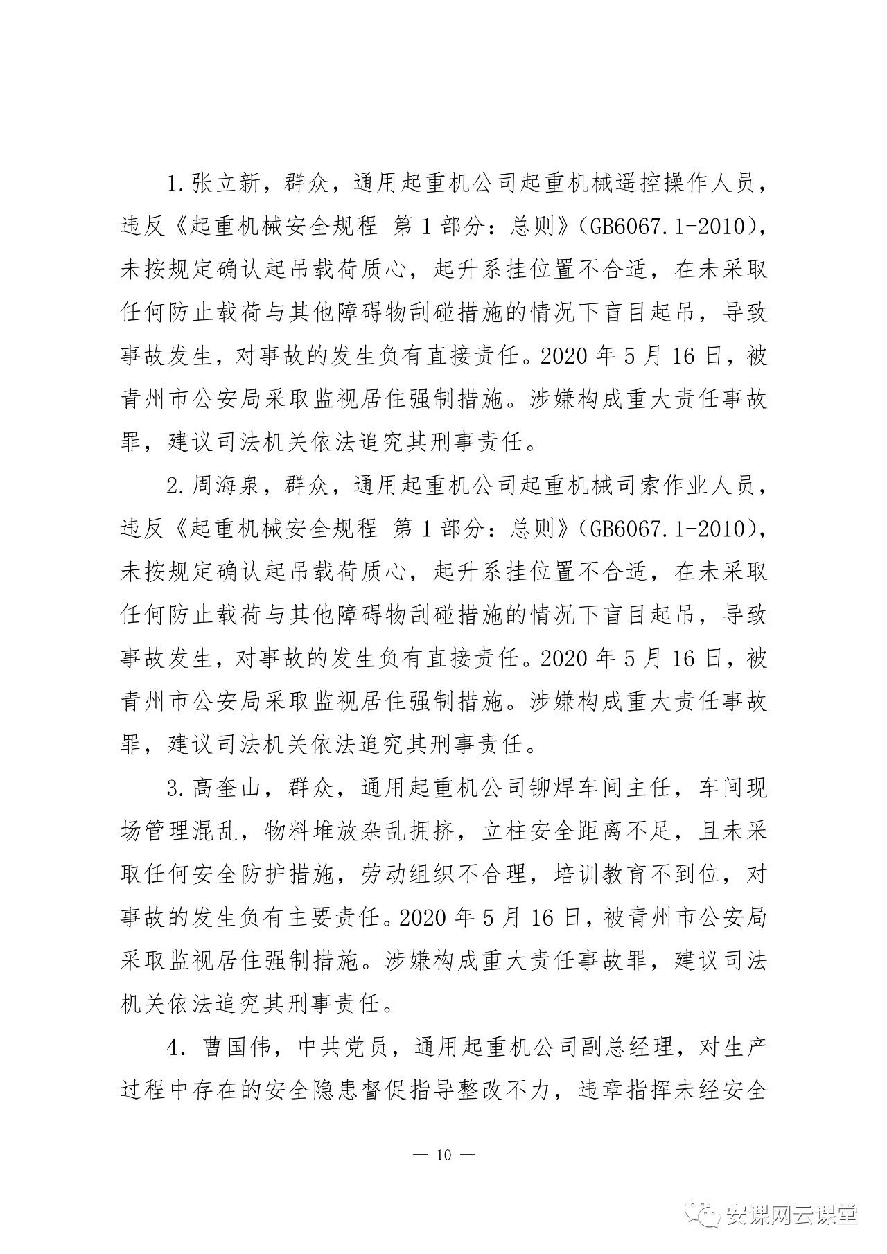 曹國偉,中共黨員,通用起重機(jī)公司副總經(jīng)理,對生產(chǎn)過程中存在的安全隱患督促指導(dǎo)整改不力,違章指揮未經(jīng)安全教育培訓(xùn)的工人上崗作業(yè),對事故的發(fā)生負(fù)有主要責(zé)任。