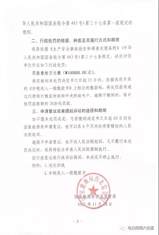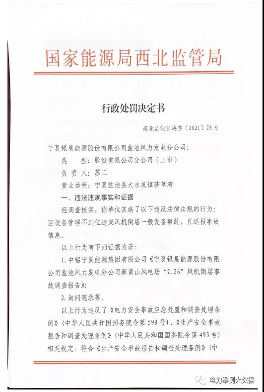 近日,國家能源局西北監(jiān)管局發(fā)布【2021】28號行政處罰決定書,因設(shè)備管理不到位造成風(fēng)機倒塔一般設(shè)備事故,且遲報事故信息,對寧夏銀星能源股份有限公司鹽池風(fēng)力發(fā)電分公司罰款10萬元。