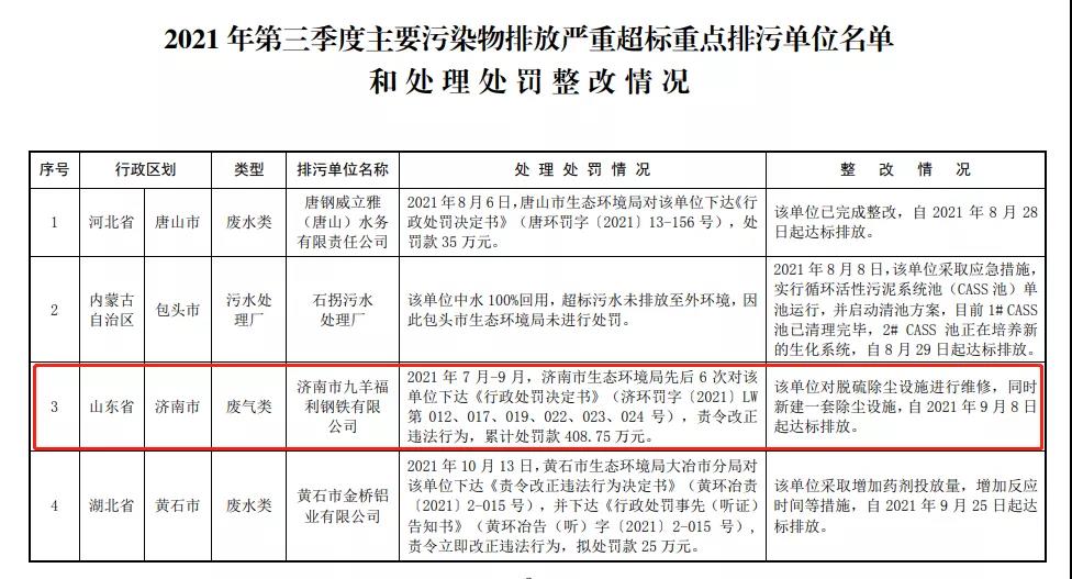 近日,生態(tài)環(huán)境部公布2021年第三季度主要污染物排放嚴(yán)重超標(biāo)重點(diǎn)排污單位名單和處理處罰整改情況。其中,濟(jì)南市九羊福利鋼鐵有限公司因廢氣類污染等環(huán)境違法行為,累計處罰款408.75萬元。