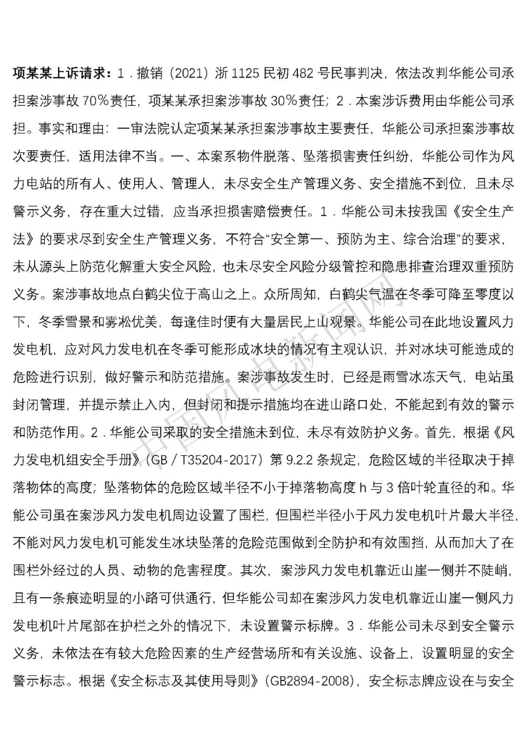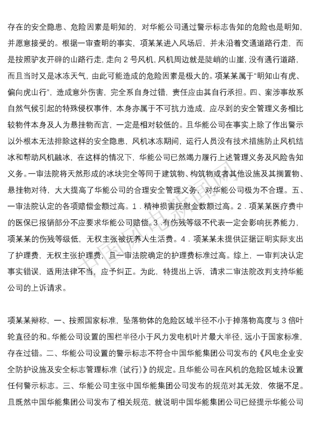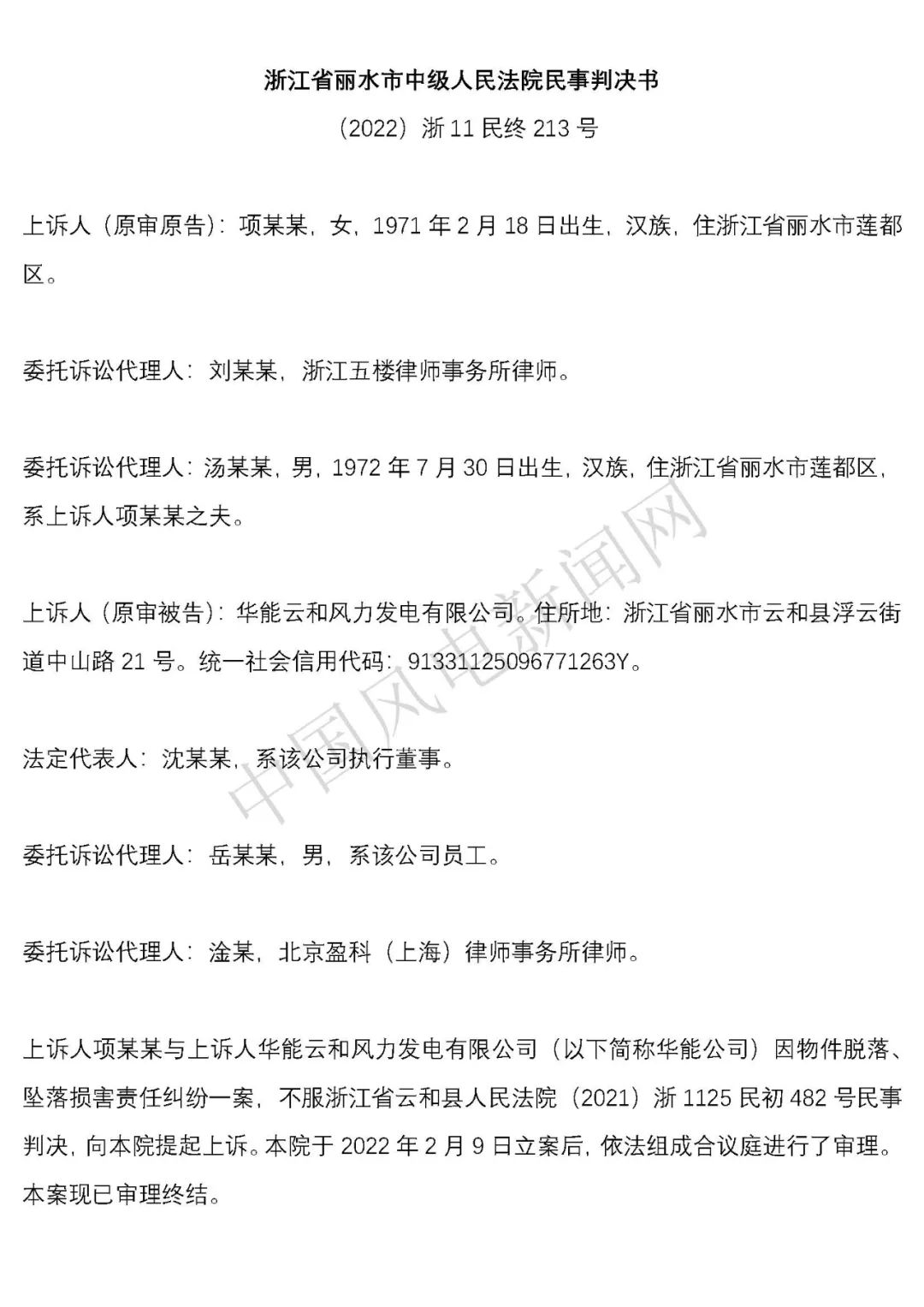 華能浙江某風電場葉片結冰冰塊掉落砸傷路人案宣判
