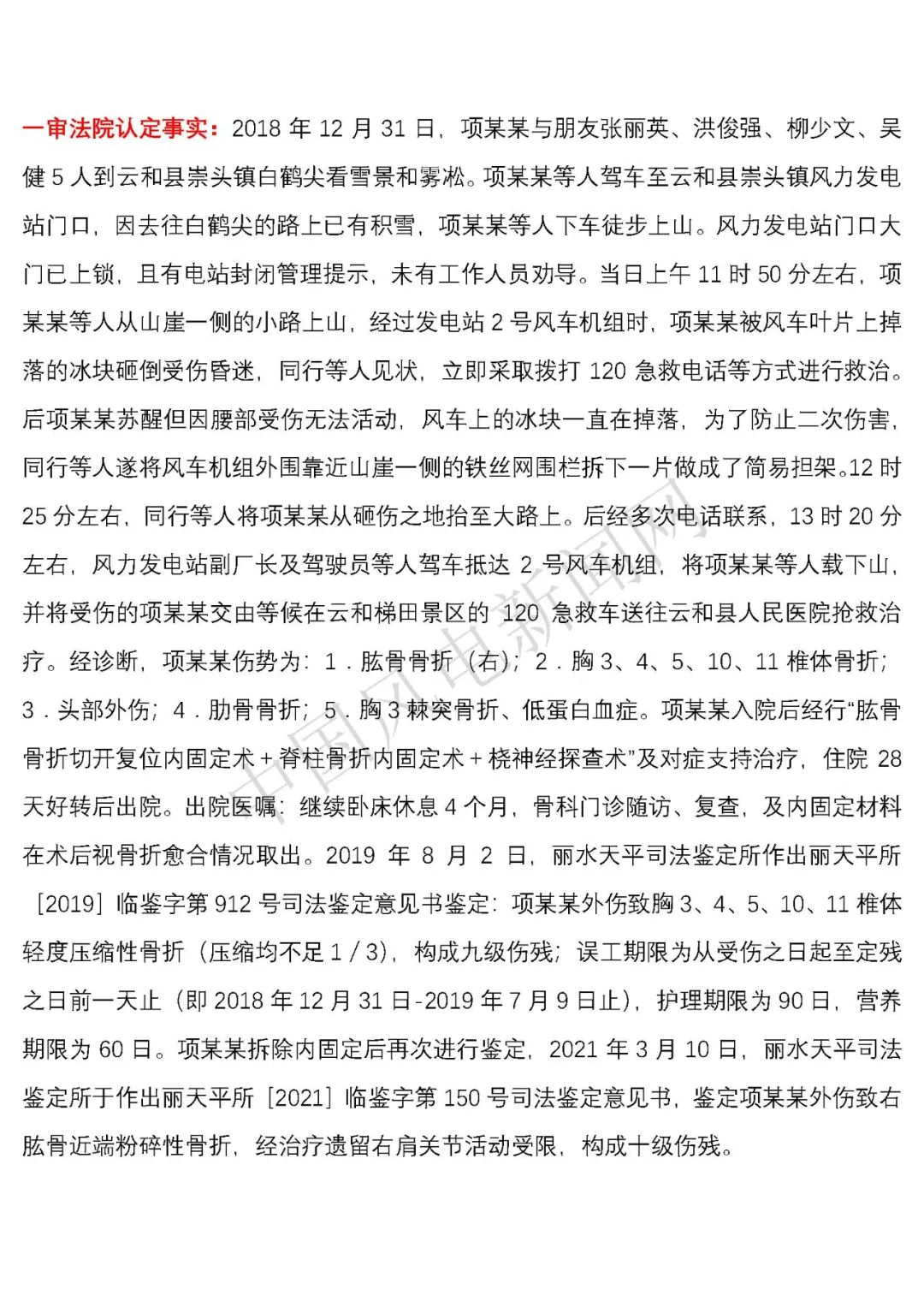 法院認定事實:2018年12月31日,項建英與朋友張麗英、洪俊強、柳少文、吳健5人到云和縣崇頭鎮(zhèn)白鶴尖看雪景和霧凇。項建英等人駕車至云和縣崇頭鎮(zhèn)風力發(fā)電站門口,因去往白鶴尖的路上已有積雪,項建英等人下車徒步上山。風力發(fā)電站門口大門已上鎖,且有電站封閉管理提示,未有工作人員勸導。當日上午11時50分左右,項建英等人從山崖一側的小路上山,經(jīng)過發(fā)電站2號風車機組時,項建英被風車葉片上掉落的冰塊砸倒受傷昏迷,同行等人見狀,立即采取撥打120急救電話等方式進行救治。后項建英蘇醒但因腰部受傷無法活動,風車上的冰塊一直在掉落,為了防止二次傷害,同行等人遂將風車機組外圍靠近山崖一側的鐵絲網(wǎng)圍欄拆下一片做成了簡易擔架。12時25分左右,同行等人將項建英從砸傷之地抬至大路上。后經(jīng)多次電話聯(lián)系,13時20分左右,風力發(fā)電站副廠長及駕駛員等人駕車抵達2號風車機組,將項建英等人載下山,并將受傷的項建英交由等候在云和梯田景區(qū)的120急救車送往云和縣人民醫(yī)院搶救治療。經(jīng)診斷,項建英傷勢為:1.肱骨骨折(右);2.胸3、4、5、10、11椎體骨折;3.頭部外傷;4.肋骨骨折;5.胸3棘突骨折、低蛋白血癥。項建英入院后經(jīng)行“肱骨骨折切開復位內固定術+脊柱骨折內固定術+橈神經(jīng)探查術”及對癥支持治療,住院28天好轉后出院。出院醫(yī)囑:繼續(xù)臥床休息4個月,骨科門診隨訪、復查,及內固定材料在術后視骨折愈合情況取出。2019年8月2日,麗水天平司法鑒定所作出麗天平所[2019]臨鑒字第912號司法鑒定意見書鑒定:項建英外傷致胸3、4、5、10、11椎體輕度壓縮性骨折(壓縮均不足1/3),構成九級傷殘;誤工期限為從受傷之日起至定殘之日前一天止(即2018年12月31日-2019年7月9日止),護理期限為90日,營養(yǎng)期限為60日。項建英拆除內固定后再次進行鑒定,2021年3月10日,麗水天平司法鑒定所于作出麗天平所[2021]臨鑒字第150號司法鑒定意見書,鑒定項建英外傷致右肱骨近端粉碎性骨折,經(jīng)治療遺留右肩關節(jié)活動受限,構成十級傷殘。