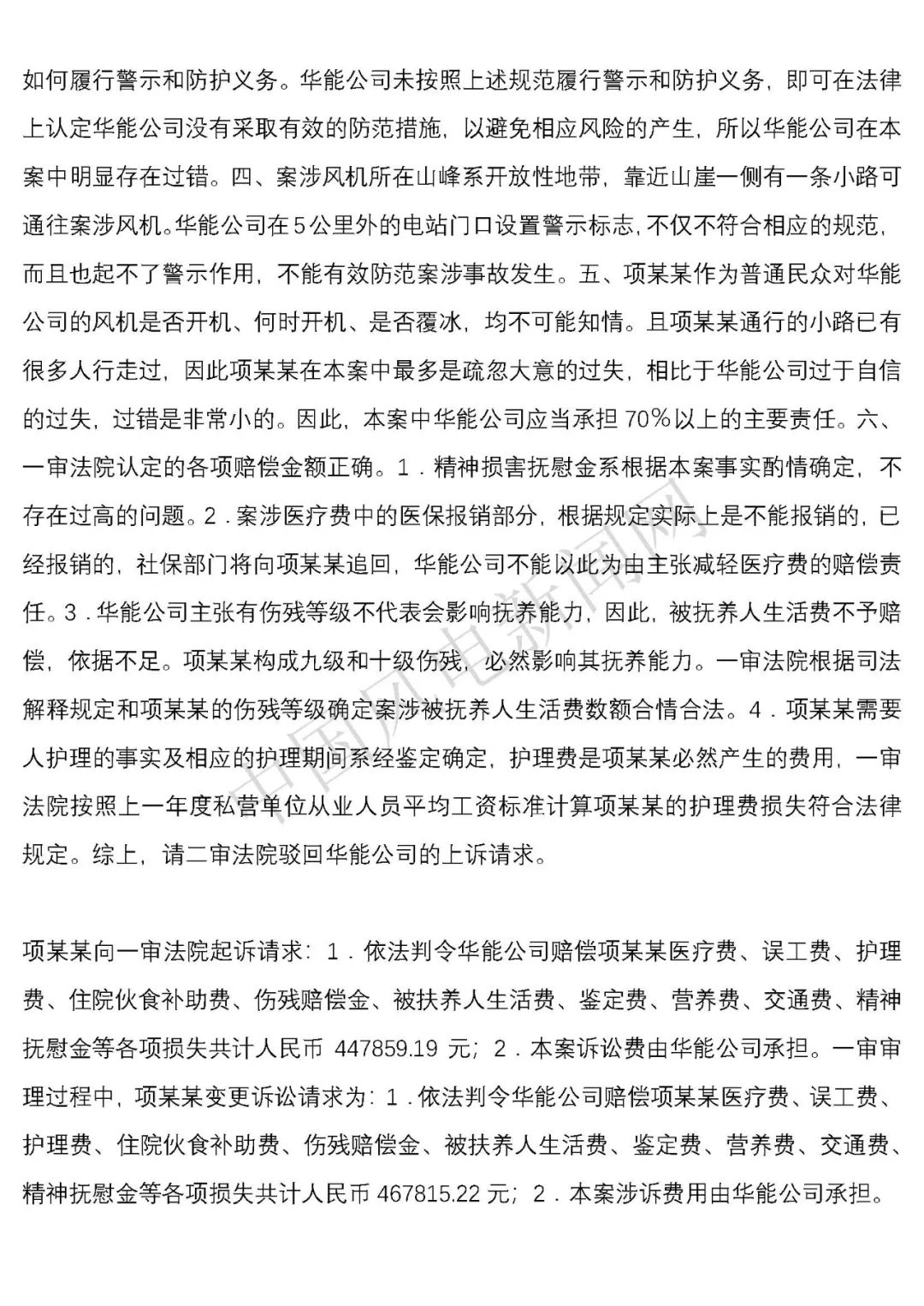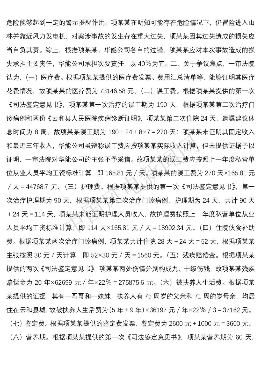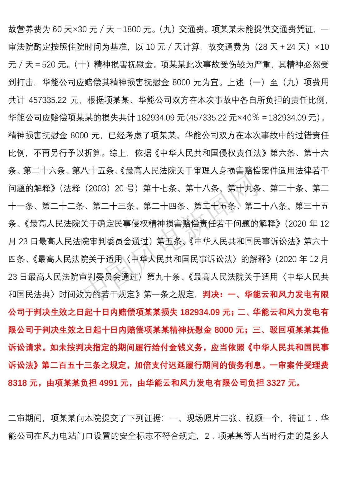 法院判決:一、華能云和風力發(fā)電有限公司于判決生效之日起十日內賠償項建英損失182934.09元;二、華能云和風力發(fā)電有限公司于判決生效之日起十日內賠償項建英精神撫慰金8000元;三、駁回項建英其他訴訟請求。