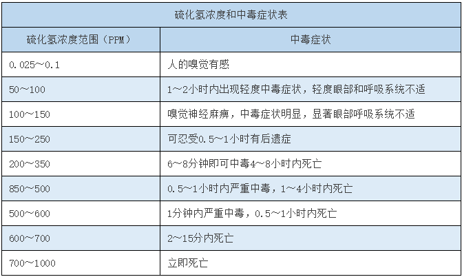 硫化氫能夠直接妨礙肌體對(duì)氧的攝取和運(yùn)輸。從而造成細(xì)胞內(nèi)呼吸酶失去活力,造成細(xì)胞缺氧窒息死亡,硫化氫的毒性很強(qiáng),人的絕對(duì)致死濃度為1000毫克/米3。當(dāng)空氣中的硫化氫濃度為10~15ppm時(shí)使人們出現(xiàn)中毒癥狀,我國的工作場地環(huán)境最大允許濃度為10ppm。