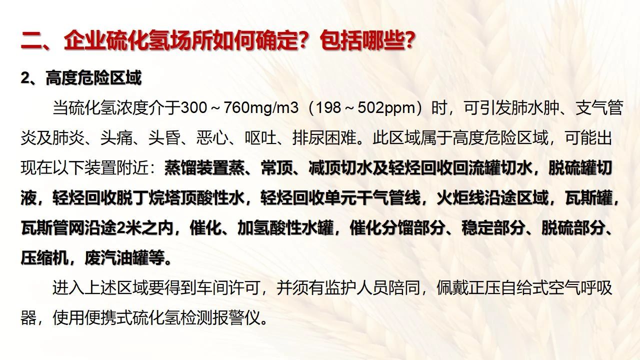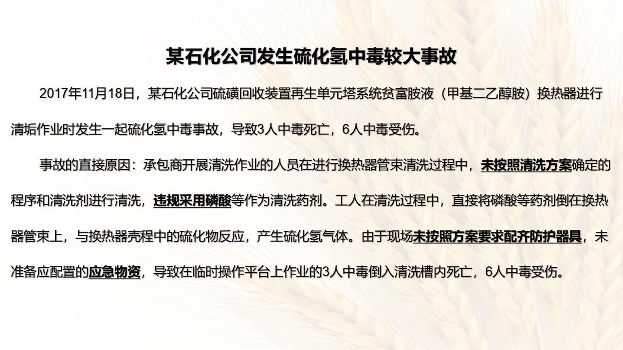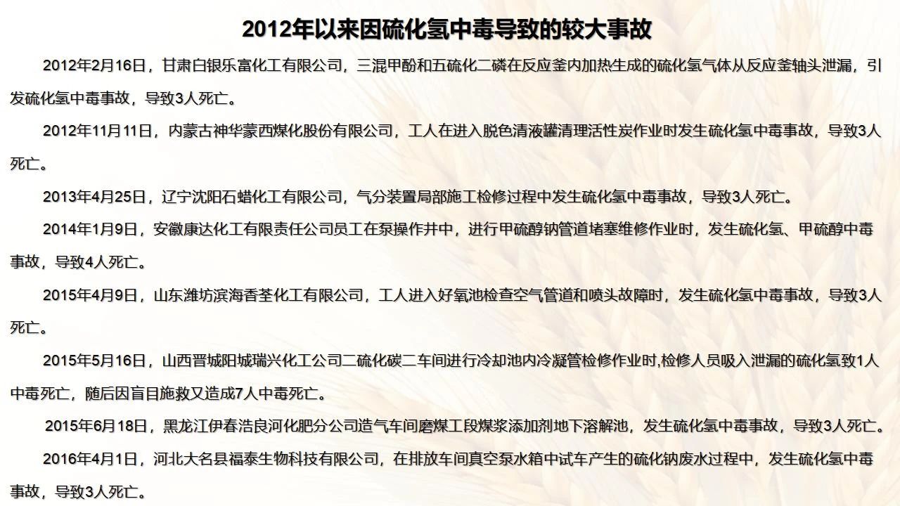 1預防措施 涉及硫化氫作業(yè)活動,必須嚴格遵守《化學品生產(chǎn)單位特殊作業(yè)安全規(guī)范》(GB 30871-2014)及相關(guān)的規(guī)范、標準、制度,并特別注意以下幾點: 1.產(chǎn)生硫化氫的生產(chǎn)設(shè)備應盡量密閉,并設(shè)置自動報警裝置(不能根據(jù)臭味來判斷危險場所硫化氫的濃度,硫化氫達到一定濃度時會導致嗅覺麻痹)。 2.對含有硫化氫的廢水、廢氣、廢渣,要進行凈化處理,達到排放標準后方可排放。 3.進入可能存在硫化氫的密閉容器、坑、窯、地溝等工作場所,應首先測定該場所硫化氫濃度,采取通風排毒措施,確認安全后方可操作。作業(yè)過程中應連續(xù)測定硫化氫濃度。 4.操作時做好個人防護措施,配好防毒用具(防毒面具一般為逃生自救用),作業(yè)工人腰間縛以救護帶或繩子。做好互保,要2人以上人員在場。 5.患有肝炎、腎病、氣管炎的人員不得從事接觸硫化氫作業(yè)。 6.加強員工有關(guān)專業(yè)安全知識技能的培訓,提高自我防護意識和能力。 2作業(yè)有關(guān)注意事項 (1)檢查采樣器是否完好,采用密閉取樣; (2)佩戴便攜式有毒有害(硫化氫)氣體檢測儀、適用的防毒用具,站在上風向,并有專人監(jiān)護; (3)采樣過程中手閥應慢慢打開,不要用扳手敲打閥門。 (1)佩戴便攜式有毒有害(硫化氫)氣體檢測儀、適用的防毒用具,站在上風向,并有專人監(jiān)護; (2)切水閥與切水口應有一定距離; (3)脫出的酸性氣要用氫氧化鈣或氫氧化鈉溶液中和,并有隔離措施,防止過路行人中毒; (4)切水過程中人不能離開現(xiàn)場。 需進入設(shè)備、容器進行檢修,應經(jīng)過加盲板、吹掃、置換、采樣分析合格、辦理進設(shè)備容器安全作業(yè)票后,才能進入作業(yè)。但有些設(shè)備容器在檢修前,需進人排除殘余的油泥、余渣,清理過程中會散發(fā)出硫化氫和油氣等有毒有害氣體,必須做好安全措施。以下七項為設(shè)備內(nèi)檢修作業(yè)步驟: (1)制定施工方案; (2)作業(yè)人員經(jīng)過安全技術(shù)培訓; (3)進設(shè)備容器作業(yè)前,必須作好氣體采樣分析; (4)辦理進入受限空間安全作業(yè)票; (5)佩戴防毒用具(空呼等),攜帶好安全帶(繩); (6)作業(yè)時間不宜過長,一般不超過30min; (7)施工過程須有專人監(jiān)護,必要時應有醫(yī)務人員在場。 (1)執(zhí)行進入受限空間作業(yè)安全防護規(guī)定; (2)控制各種物料的切水排凝進入下水道; (3)采用強制通風或自然通風,保證氧含量為18%-21%,在富氧環(huán)境下不應大于23.5%; (4)配帶防毒用具(空呼等); (5)攜帶好安全帶(繩); (6)進入下水道內(nèi)作業(yè)井下要設(shè)專人監(jiān)護,并與地面保持密切聯(lián)系。 (1)下油池清理前,必須用泵把污油、污水抽干凈,用高壓水沖洗置換; (2)采樣分析,根據(jù)測定結(jié)果確定施工方案和安全措施,辦理好進入受限空間作業(yè)票。 (3)配備防毒用具(空呼等),有專人監(jiān)護,必要時要攜好安全帶(繩); 設(shè)備、容器、管線存有硫化氫物料的堵漏、拆卸或安裝作業(yè)時,必須做到: (1)嚴格控制帶壓作業(yè),應把與其設(shè)備容器相通的閥門關(guān)死,安裝盲板,撤掉余壓;辦理相應安全作業(yè)票; (2)佩戴適用的防毒用具(空呼等),有專人監(jiān)護; (3)拆卸法蘭螺絲時,在松動之前,不要把螺絲全部拆開,嚴防有毒氣體大量沖出。 (1)平穩(wěn)操作,嚴防跑、冒、滴、漏; (2)裝置易泄漏或氣體易積聚的位置應安裝固定式硫化氫檢測報警器; (3)加強機泵設(shè)備的維護管理,減少泄漏; (4)可能有泄漏的地方加強通風; (5)涉及硫化氫物料的容器、管線、閥門等要定期檢查更換; (6)發(fā)現(xiàn)硫化氫濃度高,要先報告,采取一定防護措施后,才能進入現(xiàn)場檢查和處理。 (1)嚴禁在進、出油及調(diào)合過程中進行人工檢尺、測溫及拆裝安全附件等作業(yè); (2)必要的檢查、切水,操作人員應佩戴便攜式有毒有害(硫化氫)氣體檢測儀,站在上風向,并有專人監(jiān)護; (3)準備好適合的防毒面具,以便急用。 涉及有可能存在產(chǎn)生(逸出、外泄)硫化氫或者殘存硫化氫的清洗作業(yè)時,應事先進行風險辨識分析,并結(jié)合分析結(jié)果采取安全措施。