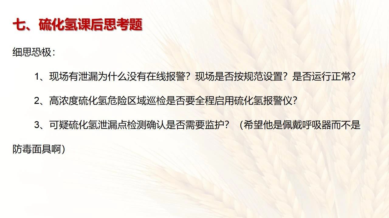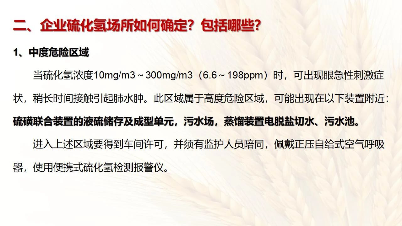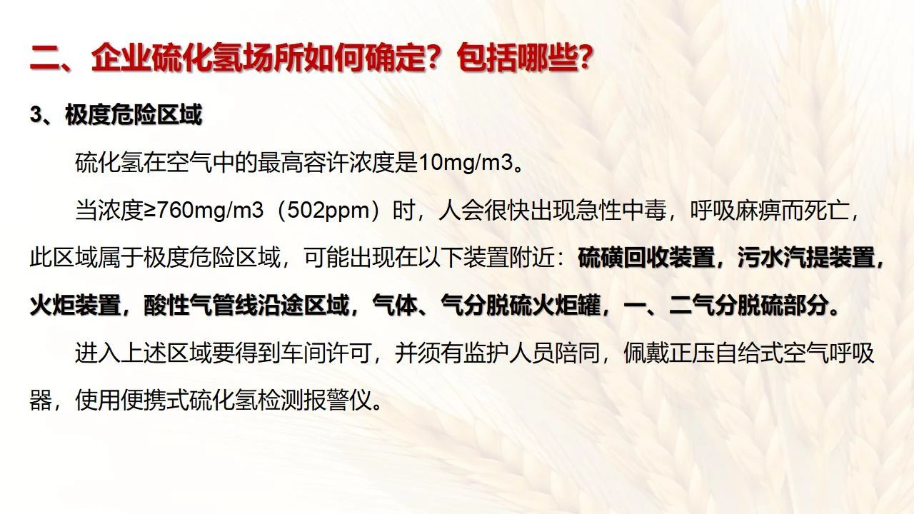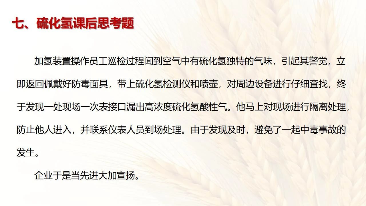 1預防措施 涉及硫化氫作業(yè)活動,必須嚴格遵守《化學品生產(chǎn)單位特殊作業(yè)安全規(guī)范》(GB 30871-2014)及相關(guān)的規(guī)范、標準、制度,并特別注意以下幾點: 1.產(chǎn)生硫化氫的生產(chǎn)設(shè)備應盡量密閉,并設(shè)置自動報警裝置(不能根據(jù)臭味來判斷危險場所硫化氫的濃度,硫化氫達到一定濃度時會導致嗅覺麻痹)。 2.對含有硫化氫的廢水、廢氣、廢渣,要進行凈化處理,達到排放標準后方可排放。 3.進入可能存在硫化氫的密閉容器、坑、窯、地溝等工作場所,應首先測定該場所硫化氫濃度,采取通風排毒措施,確認安全后方可操作。作業(yè)過程中應連續(xù)測定硫化氫濃度。 4.操作時做好個人防護措施,配好防毒用具(防毒面具一般為逃生自救用),作業(yè)工人腰間縛以救護帶或繩子。做好互保,要2人以上人員在場。 5.患有肝炎、腎病、氣管炎的人員不得從事接觸硫化氫作業(yè)。 6.加強員工有關(guān)專業(yè)安全知識技能的培訓,提高自我防護意識和能力。 2作業(yè)有關(guān)注意事項 (1)檢查采樣器是否完好,采用密閉取樣; (2)佩戴便攜式有毒有害(硫化氫)氣體檢測儀、適用的防毒用具,站在上風向,并有專人監(jiān)護; (3)采樣過程中手閥應慢慢打開,不要用扳手敲打閥門。 (1)佩戴便攜式有毒有害(硫化氫)氣體檢測儀、適用的防毒用具,站在上風向,并有專人監(jiān)護; (2)切水閥與切水口應有一定距離; (3)脫出的酸性氣要用氫氧化鈣或氫氧化鈉溶液中和,并有隔離措施,防止過路行人中毒; (4)切水過程中人不能離開現(xiàn)場。 需進入設(shè)備、容器進行檢修,應經(jīng)過加盲板、吹掃、置換、采樣分析合格、辦理進設(shè)備容器安全作業(yè)票后,才能進入作業(yè)。但有些設(shè)備容器在檢修前,需進人排除殘余的油泥、余渣,清理過程中會散發(fā)出硫化氫和油氣等有毒有害氣體,必須做好安全措施。以下七項為設(shè)備內(nèi)檢修作業(yè)步驟: (1)制定施工方案; (2)作業(yè)人員經(jīng)過安全技術(shù)培訓; (3)進設(shè)備容器作業(yè)前,必須作好氣體采樣分析; (4)辦理進入受限空間安全作業(yè)票; (5)佩戴防毒用具(空呼等),攜帶好安全帶(繩); (6)作業(yè)時間不宜過長,一般不超過30min; (7)施工過程須有專人監(jiān)護,必要時應有醫(yī)務人員在場。 (1)執(zhí)行進入受限空間作業(yè)安全防護規(guī)定; (2)控制各種物料的切水排凝進入下水道; (3)采用強制通風或自然通風,保證氧含量為18%-21%,在富氧環(huán)境下不應大于23.5%; (4)配帶防毒用具(空呼等); (5)攜帶好安全帶(繩); (6)進入下水道內(nèi)作業(yè)井下要設(shè)專人監(jiān)護,并與地面保持密切聯(lián)系。 (1)下油池清理前,必須用泵把污油、污水抽干凈,用高壓水沖洗置換; (2)采樣分析,根據(jù)測定結(jié)果確定施工方案和安全措施,辦理好進入受限空間作業(yè)票。 (3)配備防毒用具(空呼等),有專人監(jiān)護,必要時要攜好安全帶(繩); 設(shè)備、容器、管線存有硫化氫物料的堵漏、拆卸或安裝作業(yè)時,必須做到: (1)嚴格控制帶壓作業(yè),應把與其設(shè)備容器相通的閥門關(guān)死,安裝盲板,撤掉余壓;辦理相應安全作業(yè)票; (2)佩戴適用的防毒用具(空呼等),有專人監(jiān)護; (3)拆卸法蘭螺絲時,在松動之前,不要把螺絲全部拆開,嚴防有毒氣體大量沖出。 (1)平穩(wěn)操作,嚴防跑、冒、滴、漏; (2)裝置易泄漏或氣體易積聚的位置應安裝固定式硫化氫檢測報警器; (3)加強機泵設(shè)備的維護管理,減少泄漏; (4)可能有泄漏的地方加強通風; (5)涉及硫化氫物料的容器、管線、閥門等要定期檢查更換; (6)發(fā)現(xiàn)硫化氫濃度高,要先報告,采取一定防護措施后,才能進入現(xiàn)場檢查和處理。 (1)嚴禁在進、出油及調(diào)合過程中進行人工檢尺、測溫及拆裝安全附件等作業(yè); (2)必要的檢查、切水,操作人員應佩戴便攜式有毒有害(硫化氫)氣體檢測儀,站在上風向,并有專人監(jiān)護; (3)準備好適合的防毒面具,以便急用。 涉及有可能存在產(chǎn)生(逸出、外泄)硫化氫或者殘存硫化氫的清洗作業(yè)時,應事先進行風險辨識分析,并結(jié)合分析結(jié)果采取安全措施。
