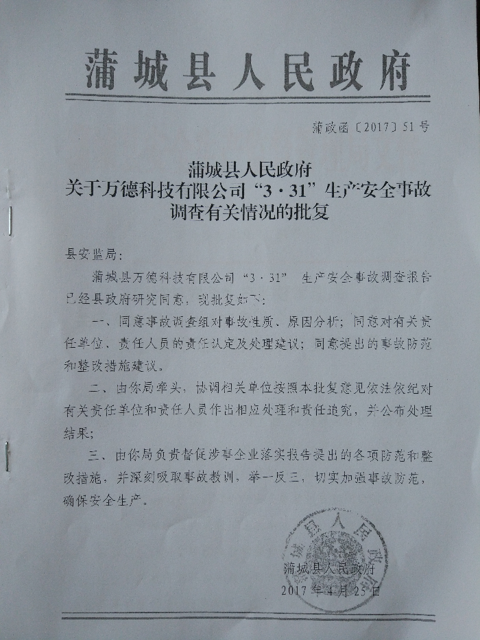 2、對(duì)本起事故主體責(zé)任單位蒲城萬德科技有限公司,依據(jù)《安全生產(chǎn)法》第一百零九條第一款,建議處以五十萬元的罰款。
