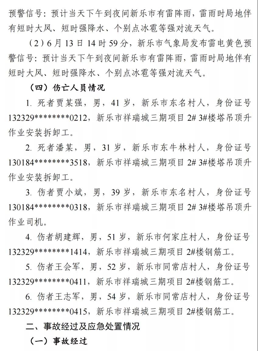 2021年6月13日下午15:50左右,河北石家莊新樂市祥瑞城建筑工地在塔吊頂升作業(yè)過程中,遇強(qiáng)對流雷雨天氣,伴有短時強(qiáng)風(fēng)和強(qiáng)降水,發(fā)生意外,2名工人不幸墜亡,4名工人受傷。