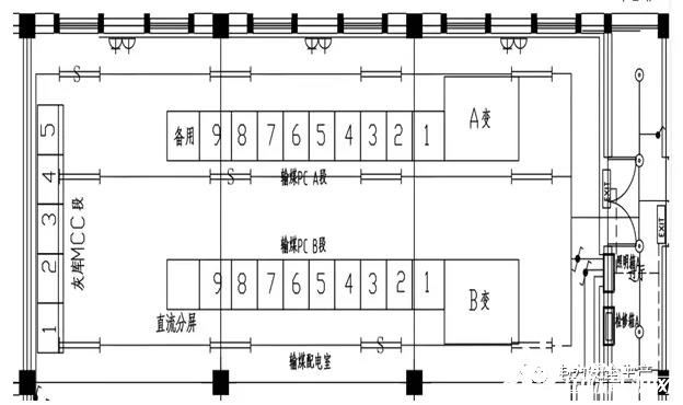 在輸煤配電室內(nèi),同時(shí)設(shè)計(jì)布置灰?guī)霢、B兩段MCC。兩段MCC各帶一個(gè)浪涌保護(hù)器,分別設(shè)置在兩段MCC進(jìn)線開(kāi)關(guān)側(cè)。400V灰?guī)霱CC開(kāi)關(guān)柜為MNS型開(kāi)關(guān)柜。灰?guī)斓裙孟到y(tǒng)的建設(shè)為A標(biāo)段的工作內(nèi)容,天津公司負(fù)責(zé)灰?guī)霱CC安裝,天津公司分包給中某建設(shè)實(shí)施。輸煤系統(tǒng)和灰?guī)祀娫唇泳€圖見(jiàn)圖一;配電室俯視示意圖見(jiàn)圖二。