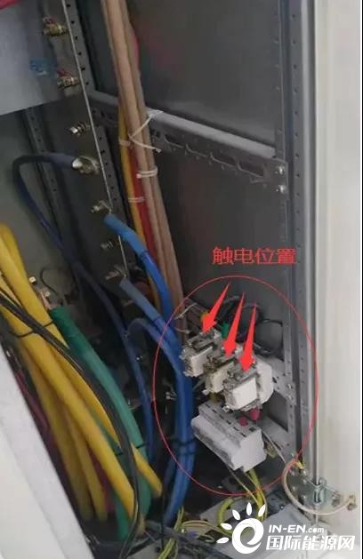 8月28日8點(diǎn)22分,王某帥(戴絕緣手套)完成本人負(fù)責(zé)的間隔電纜穿線并固定后,聽(tīng)到隔壁柜發(fā)出聲響,檢查發(fā)現(xiàn)耿某坡(穿短袖上衣、未佩戴絕緣手套)身體倒進(jìn)灰?guī)霢段MCC柜01間隔,右臂肘部及上臂與該柜浪涌保護(hù)熔斷式保險(xiǎn)上插頭(裸露)三相搭接(現(xiàn)場(chǎng)照片見(jiàn)圖三)。王某帥立即通過(guò)拖拽耿某坡鞋子將其拉出間隔,并告知現(xiàn)場(chǎng)保安撥打120急救電話,同時(shí)進(jìn)行不間斷心肺復(fù)蘇,通知本隊(duì)伍經(jīng)理霍某平。