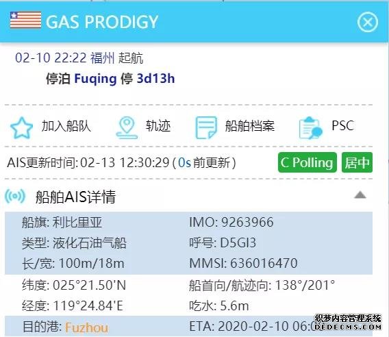 液化石油氣船“GAS PRODIGY”輪,長(zhǎng)100米,寬18米,總噸4508,載重噸3633噸,2003年建造于中國(guó)浙江船廠,入級(jí)英國(guó)勞氏船級(jí)社,隸屬希臘公司Brave Maritime Corp Inc