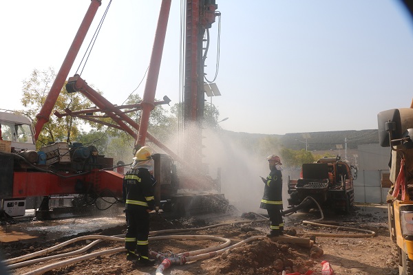 蘭州支隊七里河消防大隊第一時間到達(dá)現(xiàn)場參與處置,到達(dá)現(xiàn)場后發(fā)現(xiàn):現(xiàn)場管道仍處于天然氣泄漏狀態(tài),未有明火發(fā)生?,F(xiàn)場指戰(zhàn)員立即設(shè)置警戒線,對現(xiàn)場圍觀施工人員及群眾進(jìn)行疏散撤離,對泄露事故點(diǎn)毗鄰居民樓進(jìn)行人員通告疏散,同時設(shè)置水槍防護(hù)陣地。隨著增援中隊處置力量的到達(dá),現(xiàn)場處置指揮員七里河大隊大隊長,統(tǒng)一指揮調(diào)度現(xiàn)場事故處置力量:首先,結(jié)合現(xiàn)場街道路況,設(shè)置疏散組,對毗鄰居民樓全面進(jìn)行人員清查疏散。設(shè)置警戒組并專人看守,嚴(yán)防非事故處置人員進(jìn)入。然后在先期到達(dá)成立的消防水槍防護(hù)陣地基礎(chǔ)上,增設(shè)水槍防護(hù)陣地;其次調(diào)派到達(dá)現(xiàn)場的增援消防中隊兩臺水罐消防車全程待命,做好供水保障。