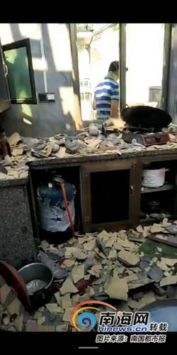 記者在當(dāng)?shù)鼐用裉峁┑囊欢我曨l中看到,發(fā)生爆炸的廚房為一間瓦房,屋內(nèi)有灶臺(tái)和一張圓桌,煤氣罐放在灶臺(tái)下方。煤氣罐上方的屋頂被沖擊波轟開(kāi),玻璃窗全被震碎,屋內(nèi)散落著碎瓦片和玻璃渣,原本放在桌上的餐具散落一地。廚房門口上方墻體出現(xiàn)半米長(zhǎng)的裂縫,震裂脫落的木門被炸飛出房門外約1米的地上,屋外的水桶等雜物也被震倒。