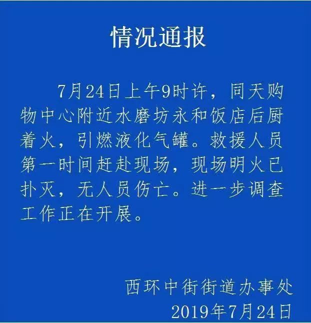 7月24日上午9時許,同天購物中心附近水磨坊永和飯店后廚著火,引燃液化氣罐。救援人員第一時間趕赴現(xiàn)場,現(xiàn)場明火已撲滅,無人員傷亡。進(jìn)一步調(diào)查工作正在開展。