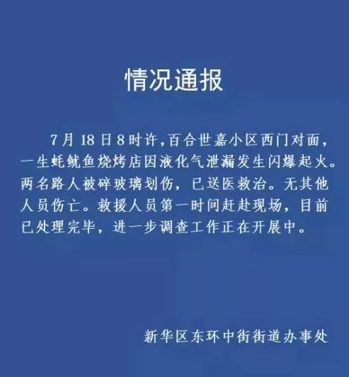 兩名路人被碎玻璃劃傷,已送醫(yī)救治,無(wú)其他人員傷亡。救援人員第一時(shí)間趕赴現(xiàn)場(chǎng),目前明火已撲滅,進(jìn)一步調(diào)查正在開(kāi)展中。