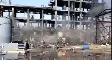 事故引發(fā)多次爆炸,造成車間中部至東部嚴(yán)重過火,車間西部框架部分損壞,二層、三層空心磚砌體全部崩出,三層樓板及樓頂變形嚴(yán)重,車間北側(cè)30米處的控制室、維修間南墻倒塌,車間西側(cè)50余米外辦公生活區(qū)內(nèi)的辦公樓、倒班宿舍樓門窗玻璃全部損壞,車間南側(cè)80米處的倉庫輕質(zhì)房頂嚴(yán)重受損。經(jīng)計(jì)算,本次事故的總爆炸當(dāng)量約為1.32tTNT。