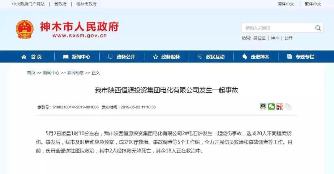 據(jù)神木市人民政府官網(wǎng)消息,5月2日凌晨1時許,該市陜西恒源投資集團電化有限公司2#電石爐發(fā)生一起燒傷事故,造成20人不同程度燒傷,其中2人經(jīng)搶救無效死亡。