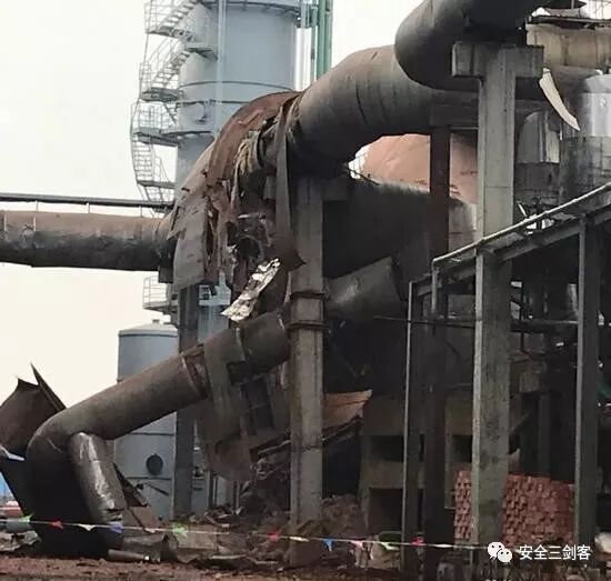 (2)高溫過(guò)熱器的南側(cè)護(hù)板炸飛至12#造氣爐北側(cè)(距離約15m);鍋筒南側(cè)護(hù)板炸毀向南側(cè)傾倒,北側(cè)護(hù)板整體向北側(cè)傾倒。