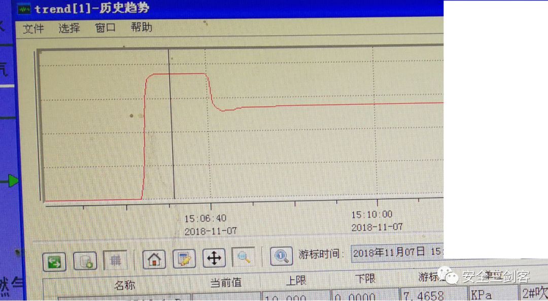 注:上圖為2#尾氣爐鼓風(fēng)機(jī)出口壓力DCS數(shù)據(jù)。從圖中可以看出風(fēng)機(jī)啟動(dòng)后升壓至7.4658kPa、壓力突降至約5.5kPa的過(guò)程。