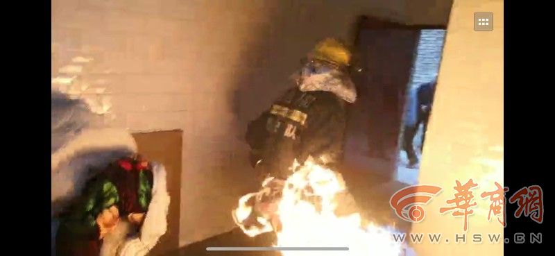 救援現(xiàn)場(chǎng)消防員從居民家提著著火的煤氣罐,一路跑出院外,經(jīng)過(guò)用厚毯子、濕抹布等,最終將煤氣罐上的明火撲滅。隨后,消防員慢慢擰開煤氣罐進(jìn)行檢查確認(rèn)。