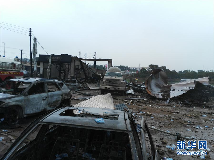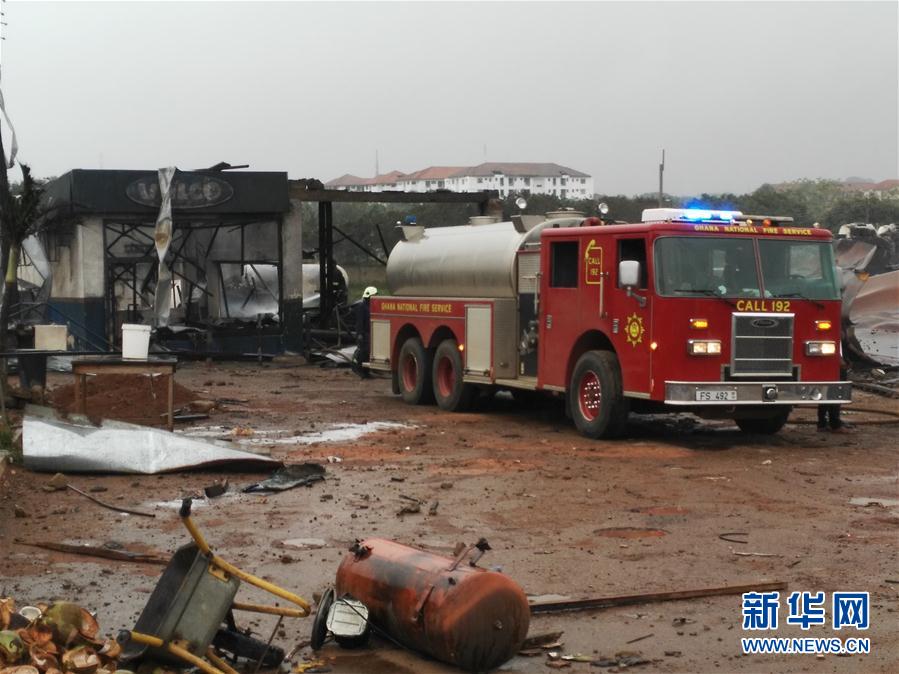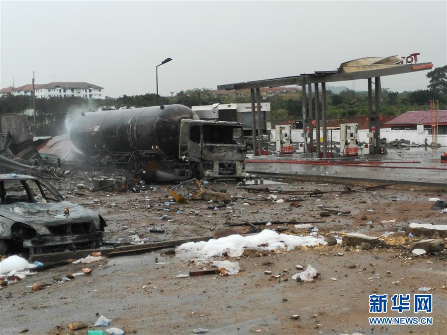 這是10月8日在加納首都阿克拉拍攝的燃?xì)庹颈ìF(xiàn)場。加納國家消防局發(fā)言人安那格雷特8日說,加納首都阿克拉市區(qū)北部7日晚發(fā)生的燃?xì)庹颈ㄒ言斐芍辽?人死亡、35人受傷。新華社發(fā)(賈斯蒂斯·阿道伯伊攝)