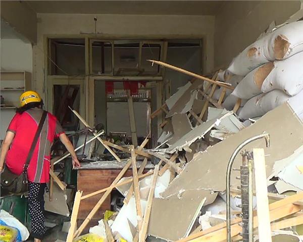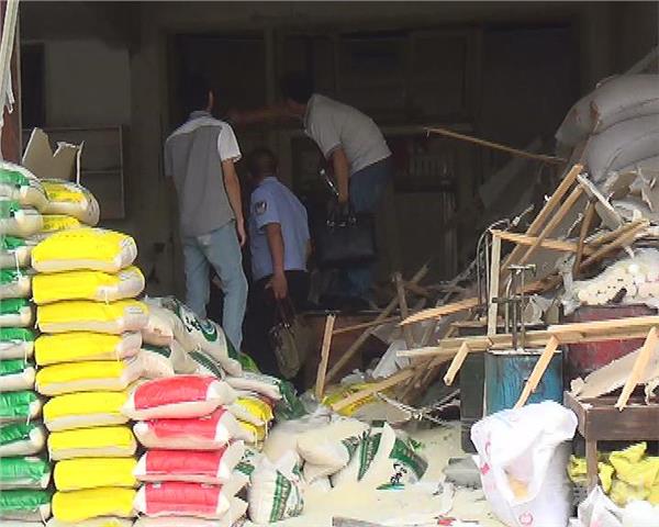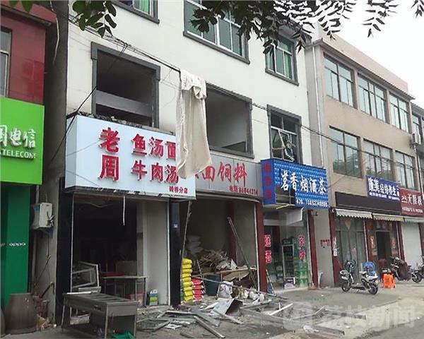 記者現(xiàn)場看到工人正在拆卸樓上被炸碎裂的玻璃窗戶,樓下全是窗戶玻璃碎片,爆炸的牛肉面館和隔壁的房東餃面飼料店里一片狼藉,隔壁移動公司和一個煙酒店玻璃窗戶和門牌也被炸碎裂和損壞。記者進(jìn)入餃面店發(fā)現(xiàn),里面操作臺旁邊還有煤氣瓶,房頂砸脫落熏黑,房東房間窗戶也被炸彎曲變形,隔壁房東的店鋪里面也是狼藉一片,整袋的米和飼料包裝袋被砸損。大門也被砸壞。