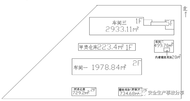 (3)2016年3月至2017年6月,先后建設(shè)甲類倉(cāng)庫(kù)、甲類車間(車間一)、丙類倉(cāng)庫(kù)、輔助用房,2017年7月開始設(shè)備安裝,2017年12月基本建成。(見下圖)